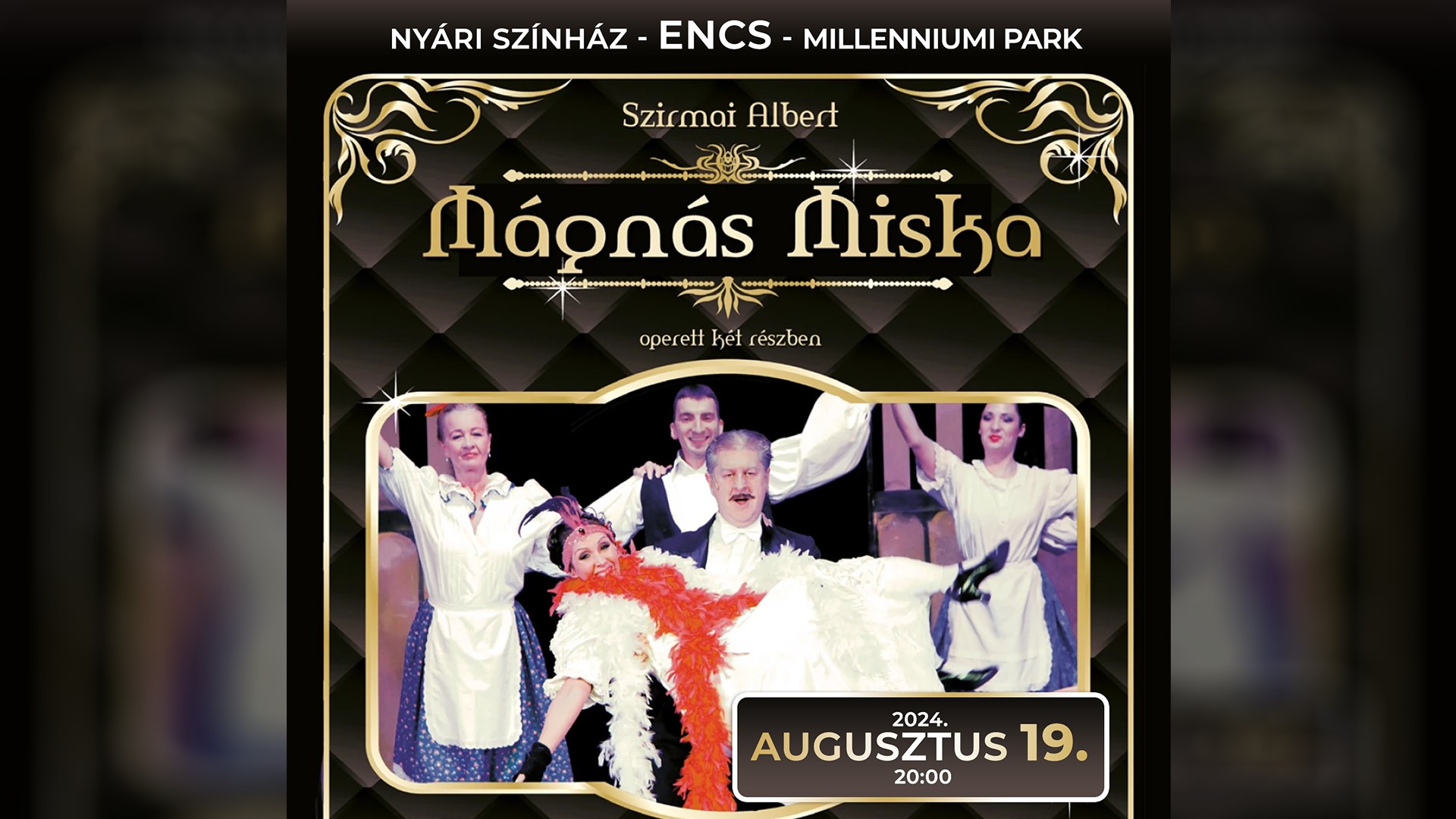 ENCS MILLENNIUMI PARK Milleniumi park, EncsA Millenniumi parkszínpadon augusztus 19-én a Pesti Művész Színház bemutatja: Mágnás Miska (operett). MÁGNÁS MISKAOperett két felvonásbanSzirmai Albert műve alapján 1916-ban mutatta be a pesi Király Színház a Mágnás Miskát. A színház jól számított, amikor a darabot színre vitte. A Mágnás Miska dallamait országszerte énekelték. A „Hoppsza Sári”, „Cintányéros cudar világ”, „A nő szívét ki […]